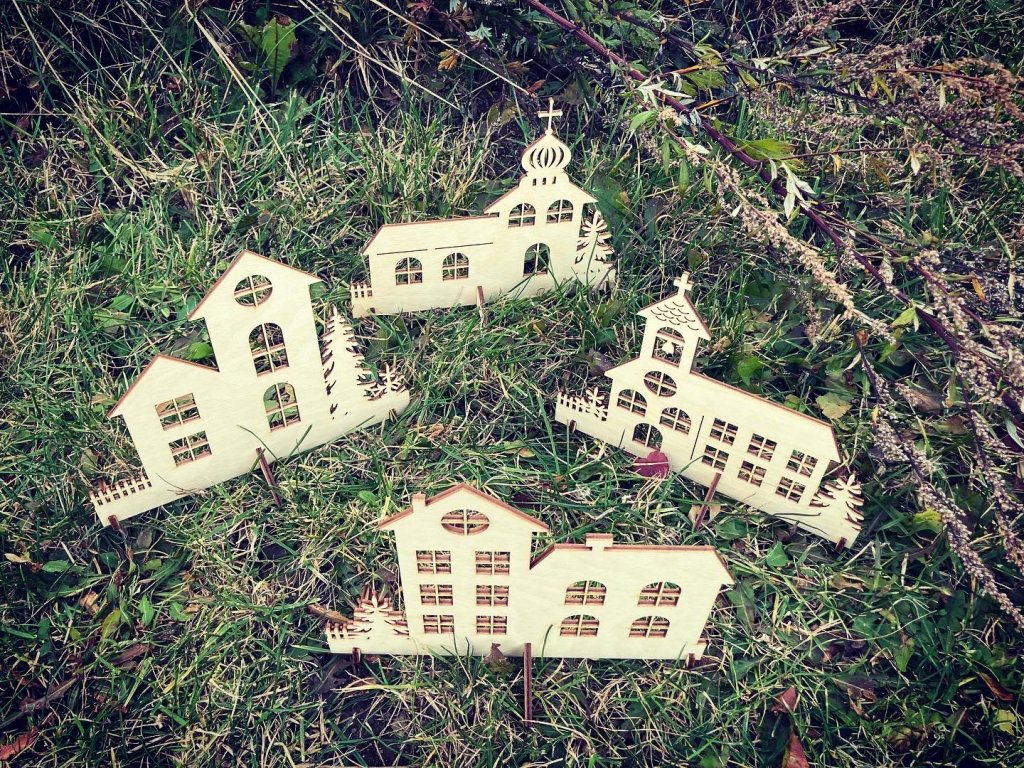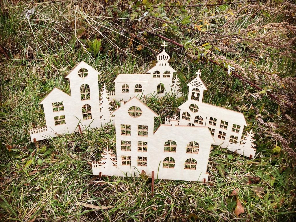 Dřevěná dekorace k postavení v podobě vesničky. Ručně dobroušeno, NON TOXIC. Dekorace za okno vhodná ke tvoření s dětmi.