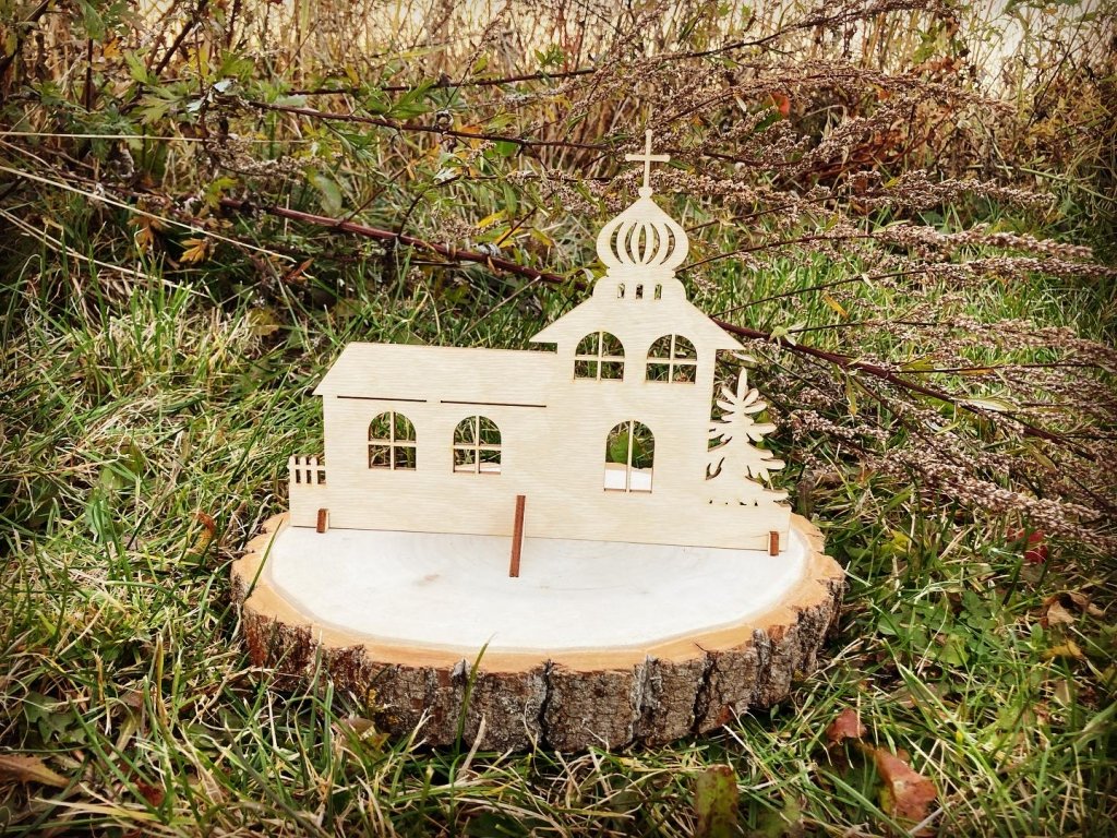 Dřevěná dekorace s motivem města Městečko na postavení například za okno Součástí je podstavec, složeno ze 3 kusů