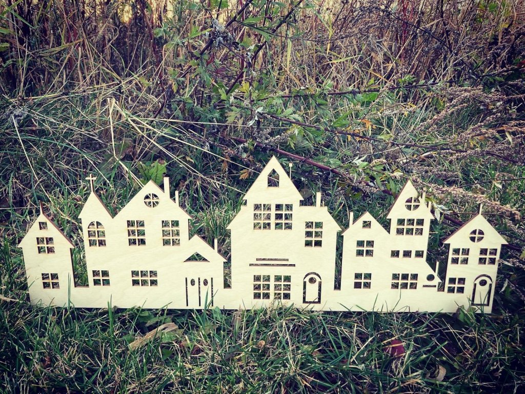 Sestava domečků na postavení. Stojánky jsou součástí dekorace.