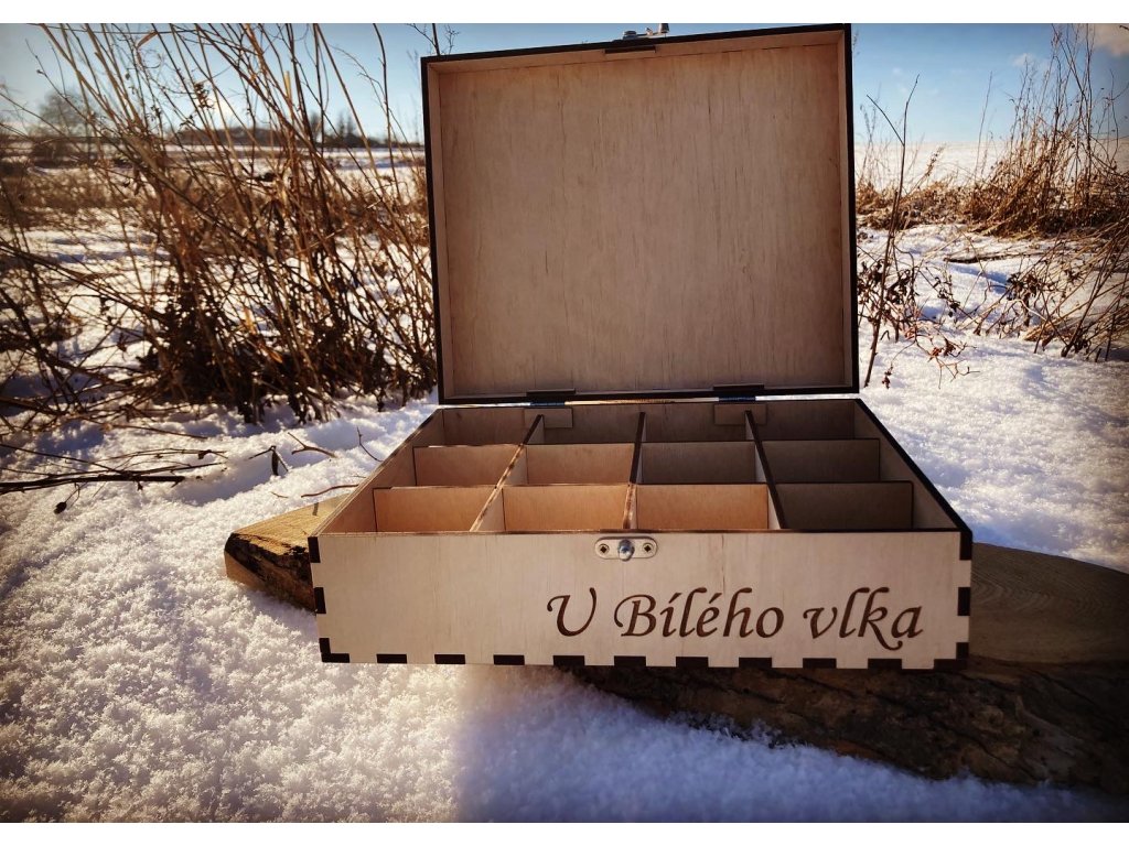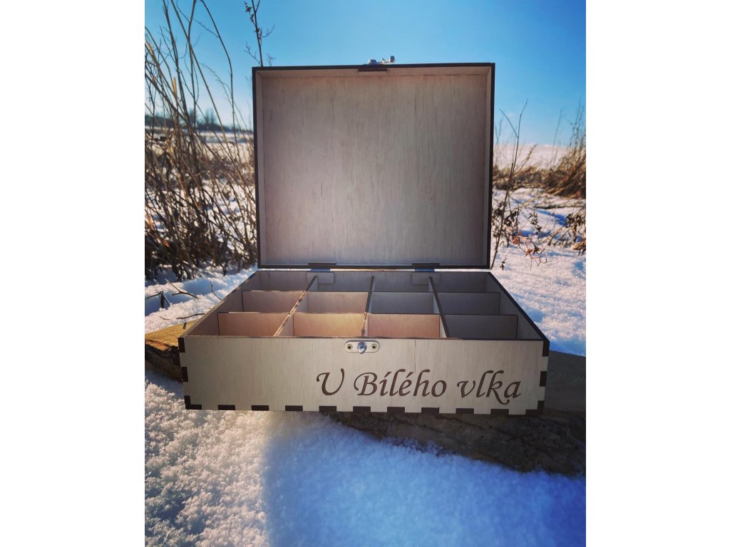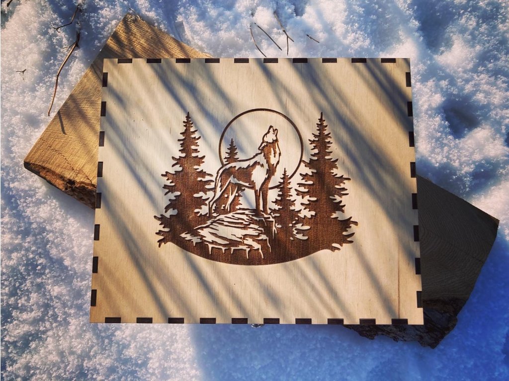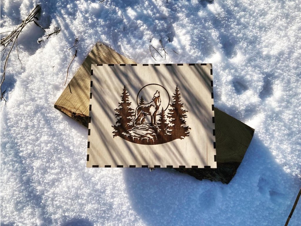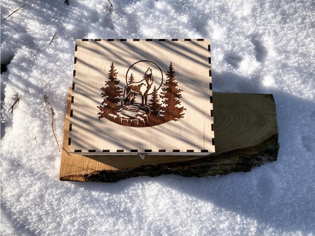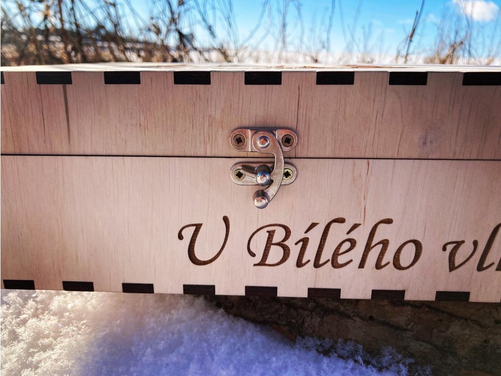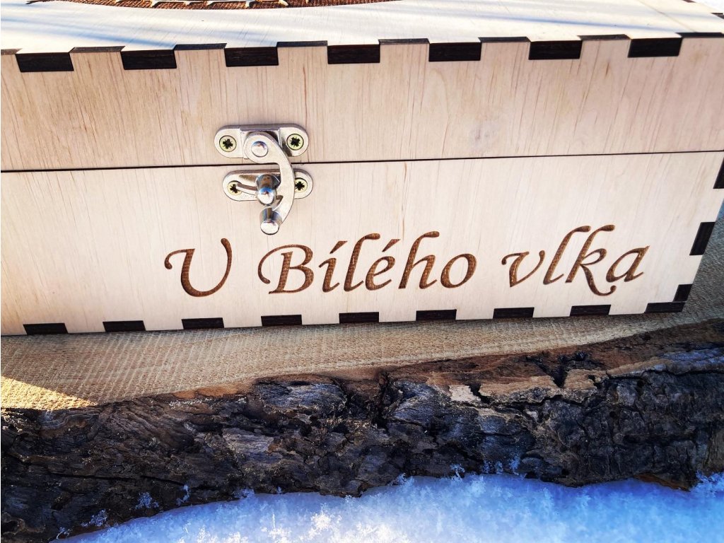 - V základní verzi je krabička bez gravírování obrázku (vlka) i bez gravírování nápisu