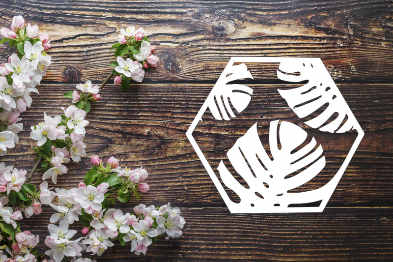 Hexagony s listy - 2 varianty Papírová dekorace v podobě listů v hexagonu (Monstera) Dekorace z papíru na okno nebo dveře..