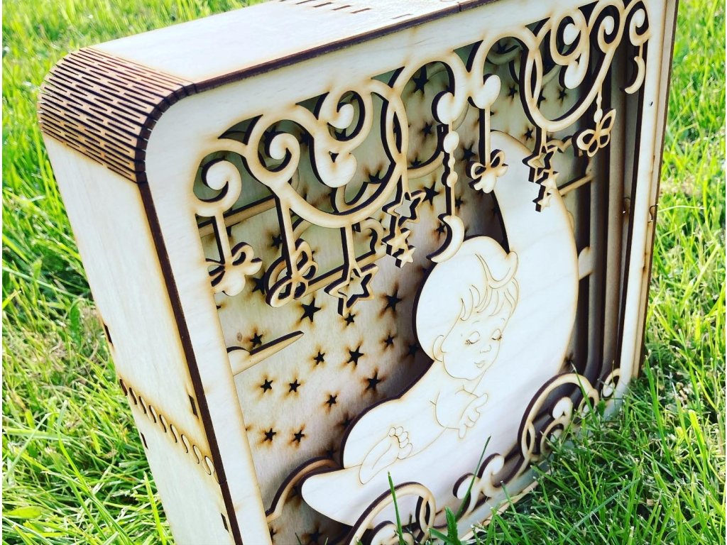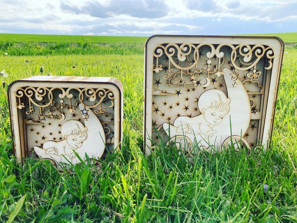 - dřevěná lampa s motivem miminka. vhodný dárek pro narozené miminko nebo čerstvé rodiče