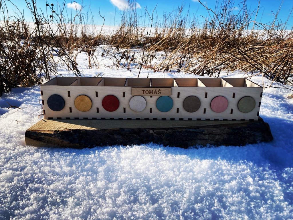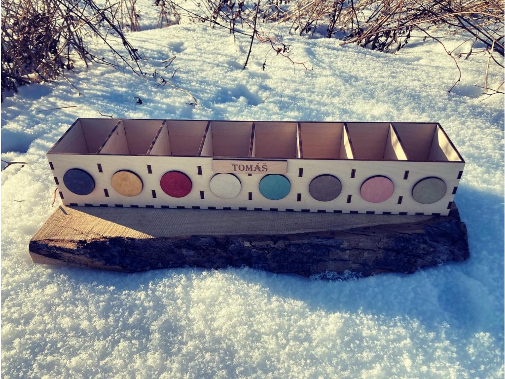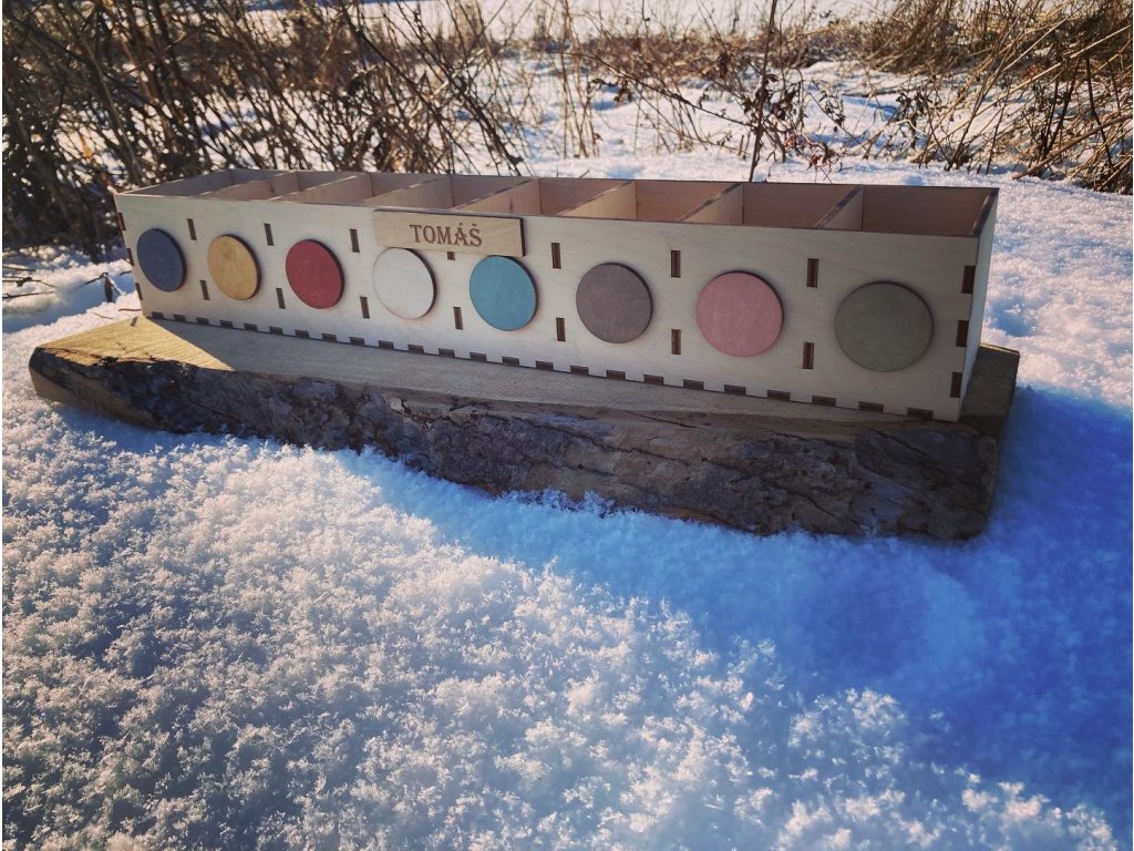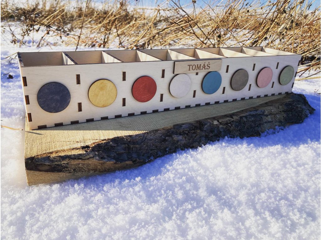 Nádherný a velký pastelkovník v kombinaci s 8 barevnými kolečky. Kolečka jsou nabarvena a natřena lakem nebo voskem. Lze jej objednat se JMÉNEM i bez :-)