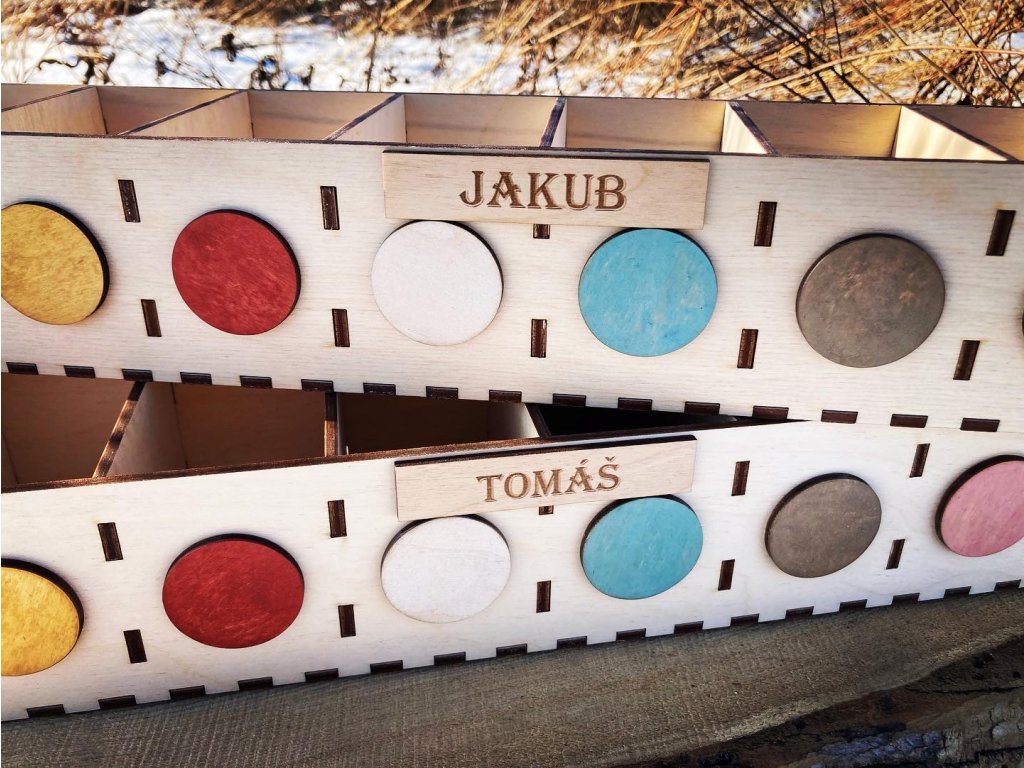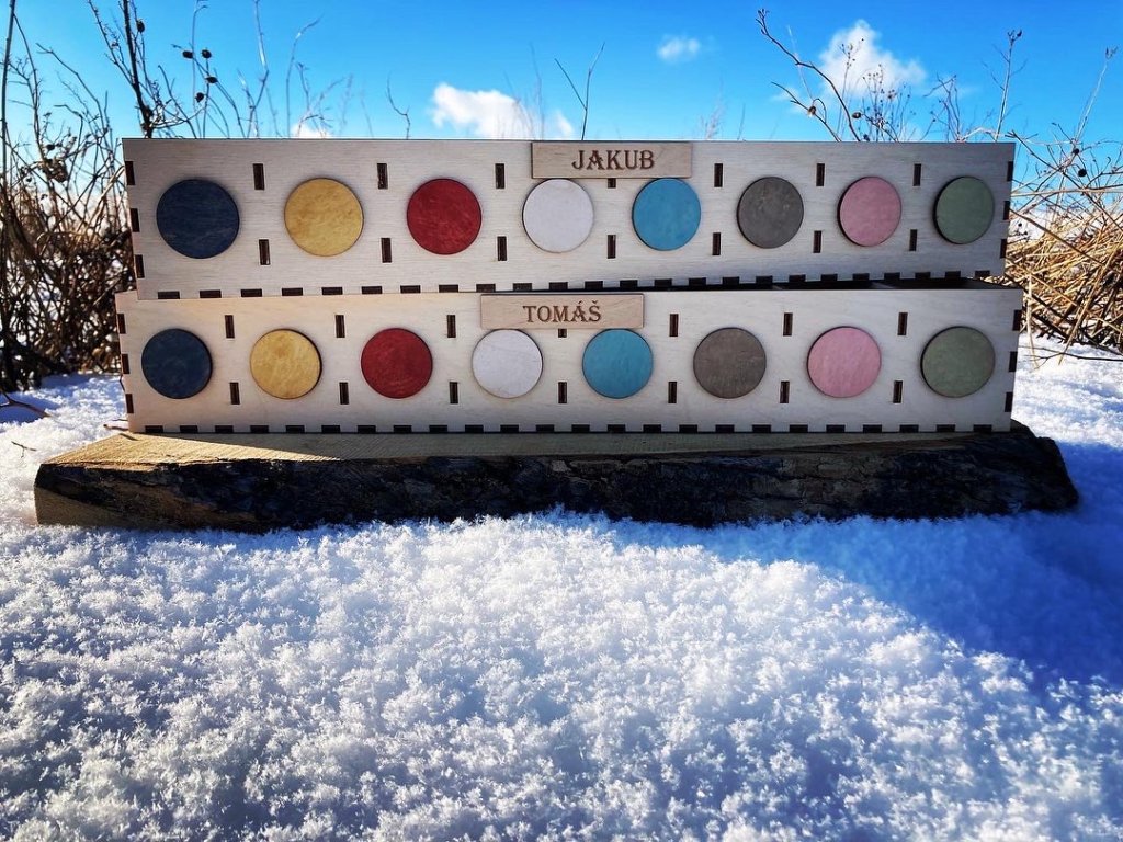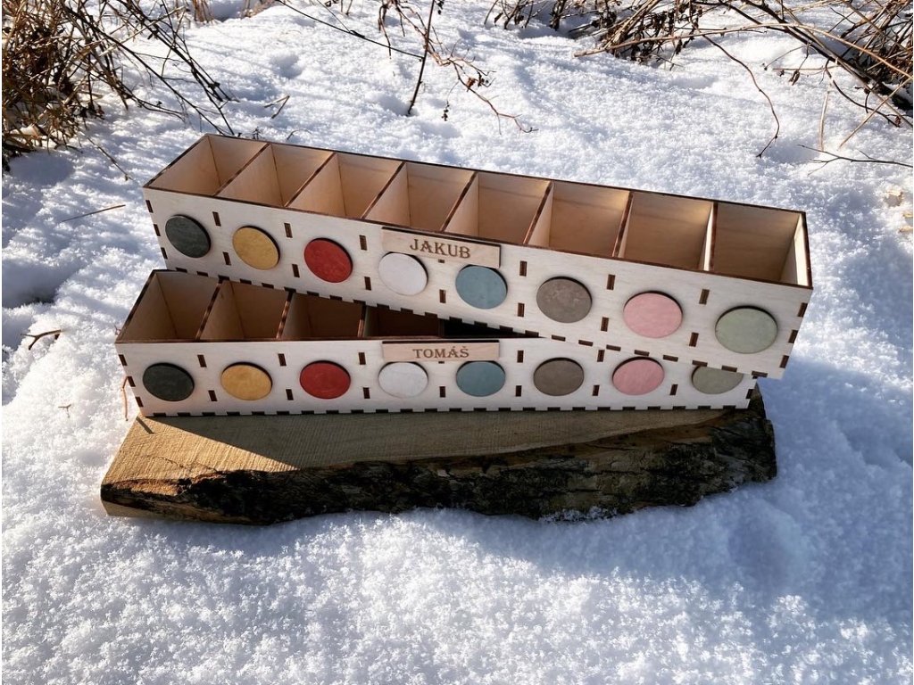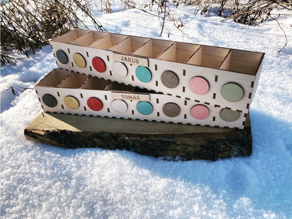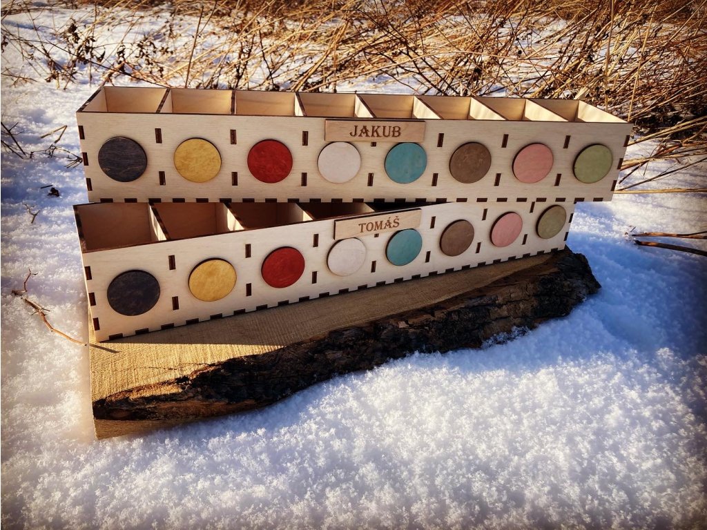 Nádherný a velký pastelkovník v kombinaci s 8 barevnými kolečky. Kolečka jsou nabarvena a natřena lakem nebo voskem. Lze jej objednat se JMÉNEM i bez :-)