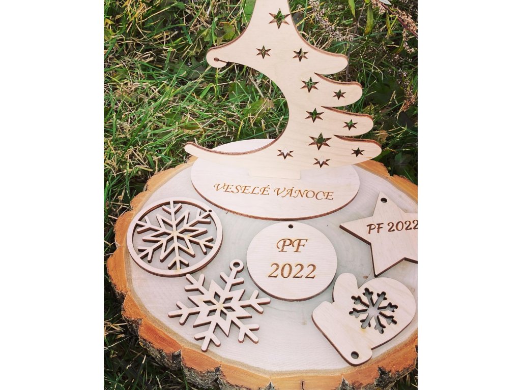 Krásný moderní vánoční stromeček a baňkami. Včetně stojánku, různé velikosti. Vánoční dřevěná dekorace, NON TOXIC.