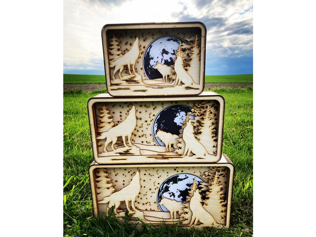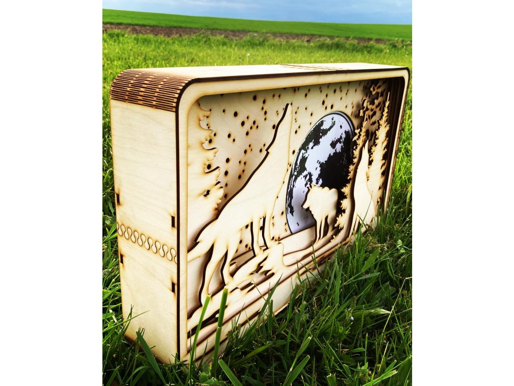 Jedinečné spojení vlků a měsíce Měsíc je vytištěný, zalaminovaný a je zcela prosvětlen Dřevěná lampa s vlky
